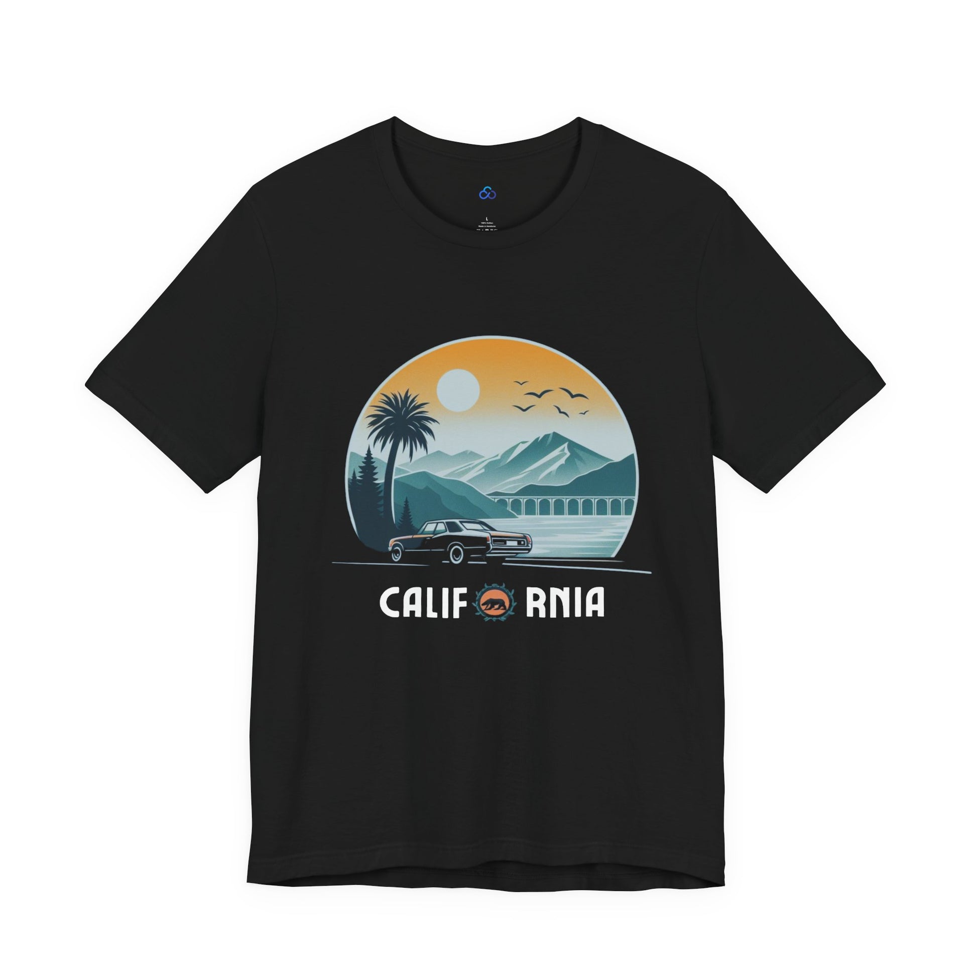 Hit the road and embrace the essence of the West Coast with the "Golden Coast" t-shirt. This retro-inspired design showcases a classic car cruising along California's scenic coastal highway, with towering palm trees, majestic mountains, and a serene sunset in the background. The word "California" is prominently displayed below the graphic, featuring the iconic bear emblem in the center, symbolizing the state's natural beauty and adventurous spirit. Made from high-quality, soft fabric, this t-shirt offers comfort and style, perfect for any California dreamer.