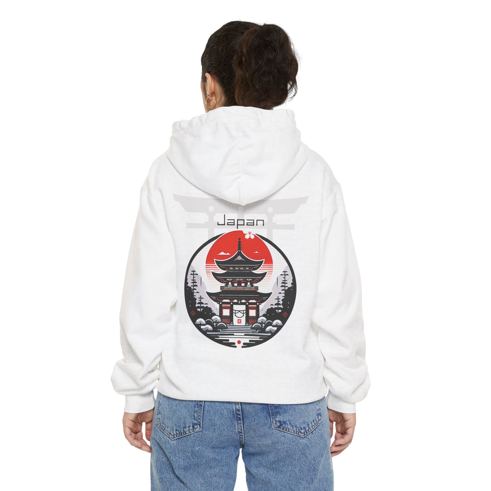 Embrace the serene beauty of Japan with the "Japan" hoodie. This design features a traditional Japanese pagoda set against a striking red sun, symbolizing peace and tranquility. The scene is framed by a classic Torii gate and includes elements of nature with carefully crafted trees and rocks, highlighting the harmony between architecture and the natural world.