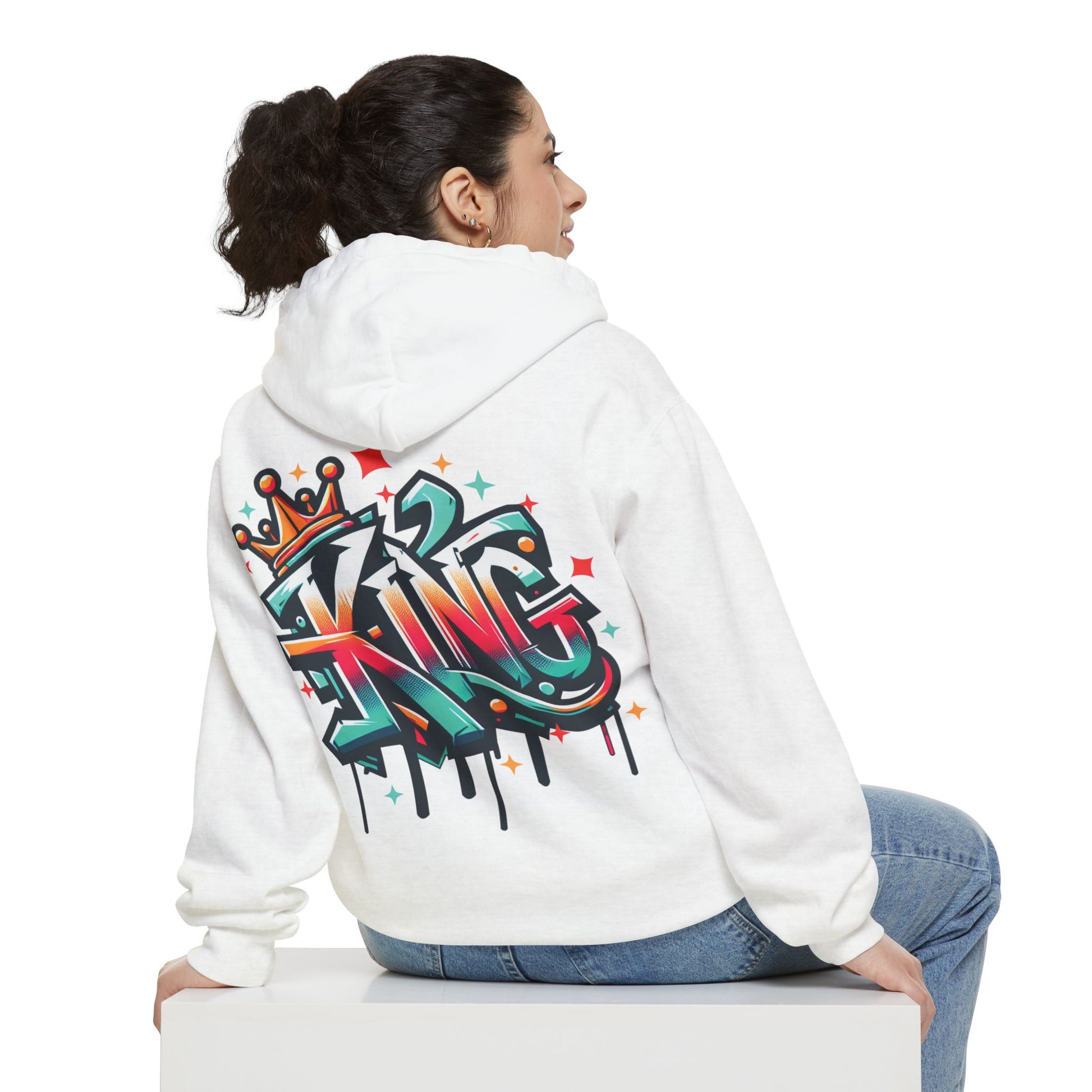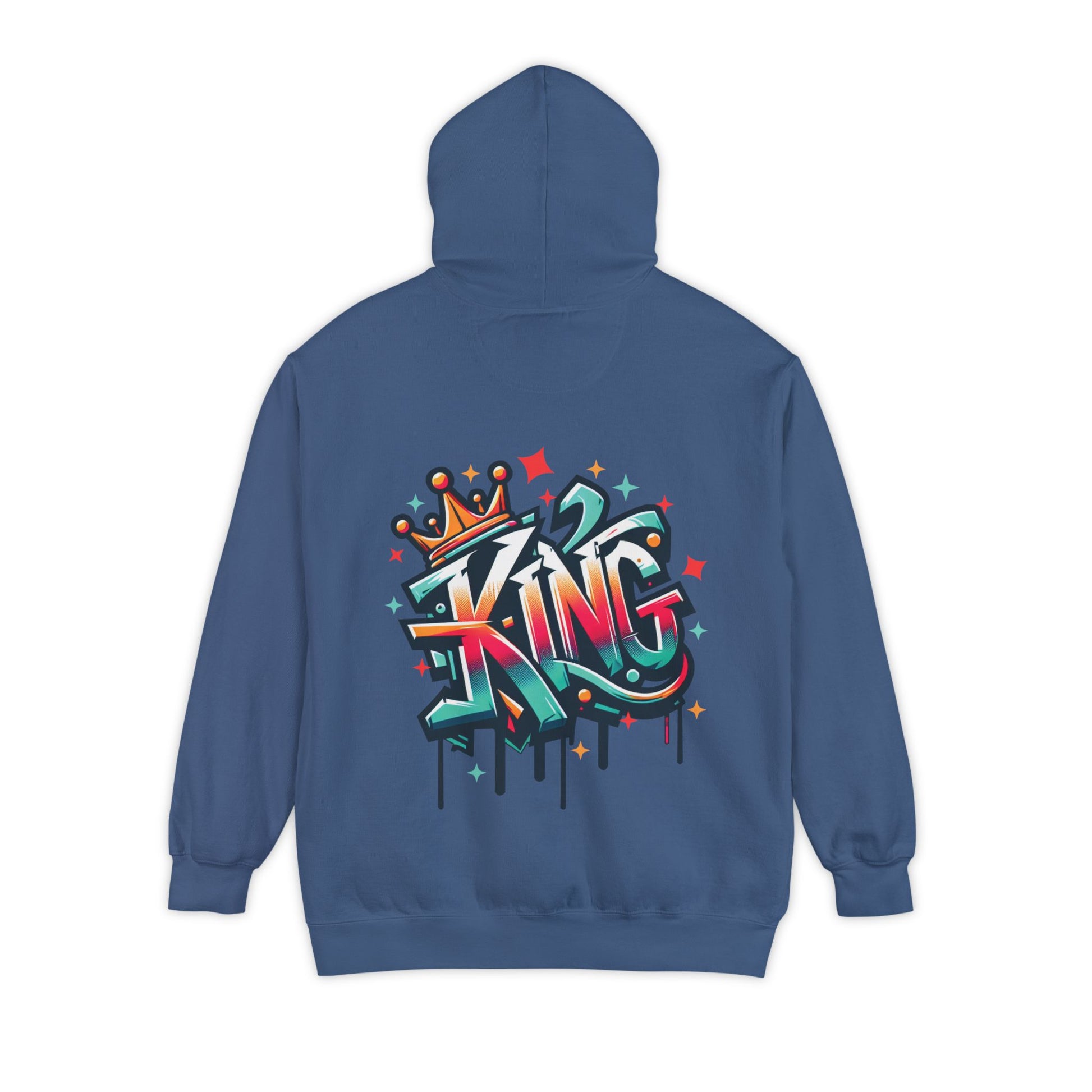 Rule your style domain with our "King" hoodie. This bold and vibrant design features the word "King" rendered in dynamic, graffiti-style lettering. The rich blend of colors—teal, orange, red, and yellow—creates a striking visual effect, while the dripping paint details and star accents add an edgy, urban touch. Topped with a crown, this design exudes confidence and authority, making it perfect for those who want to make a statement. Printed on high-quality, comfortable fabric, this t-shirt is ideal for casual wear and anyone who embraces their inner king. It’s a powerful addition to any wardrobe, blending street art with regal flair.