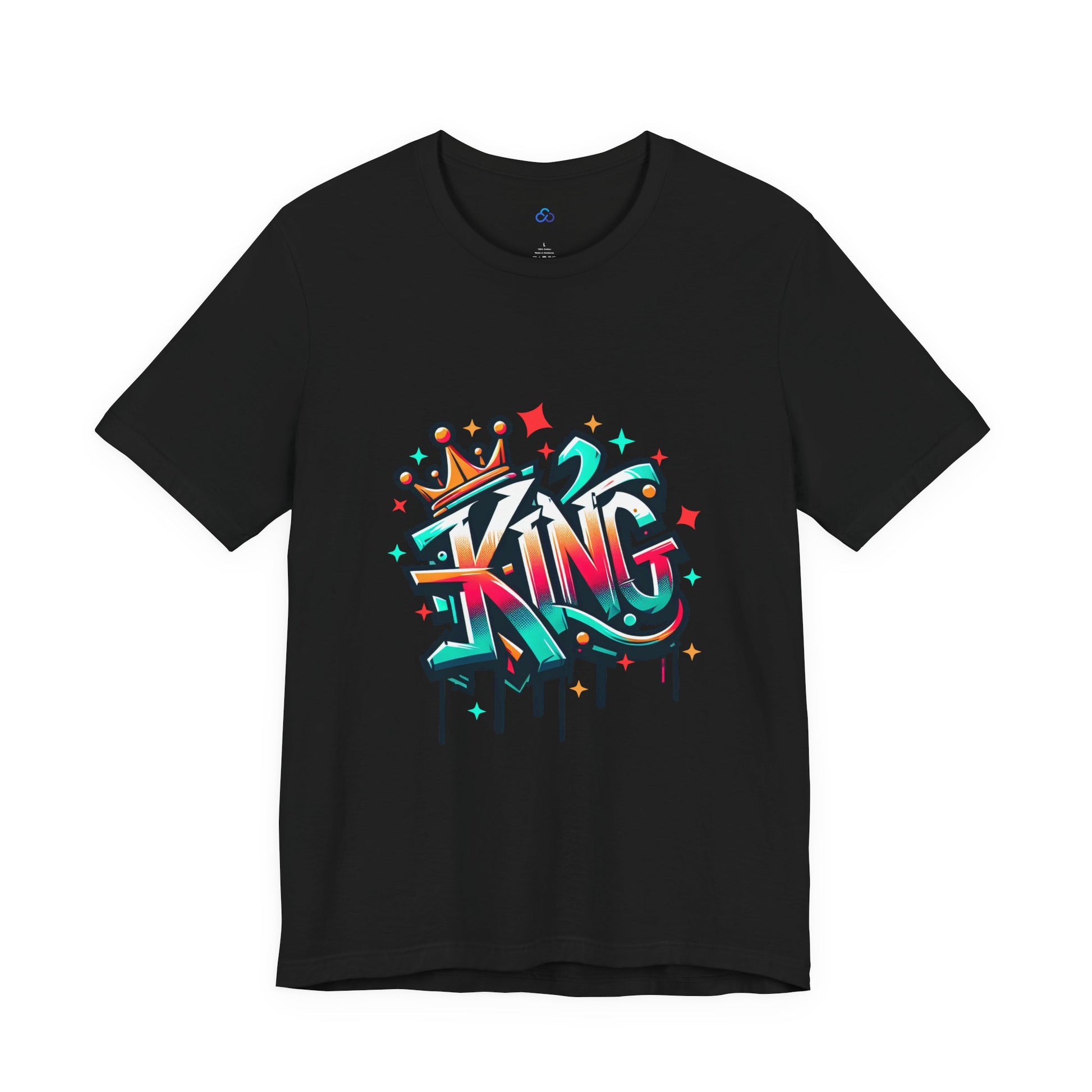 Rule your style domain with our "King" t-shirt. This bold and vibrant design features the word "King" rendered in dynamic, graffiti-style lettering. The rich blend of colors—teal, orange, red, and yellow—creates a striking visual effect, while the dripping paint details and star accents add an edgy, urban touch. Topped with a crown, this design exudes confidence and authority, making it perfect for those who want to make a statement. Printed on high-quality, comfortable fabric, this t-shirt is ideal for casual wear and anyone who embraces their inner king. It’s a powerful addition to any wardrobe, blending street art with regal flair.