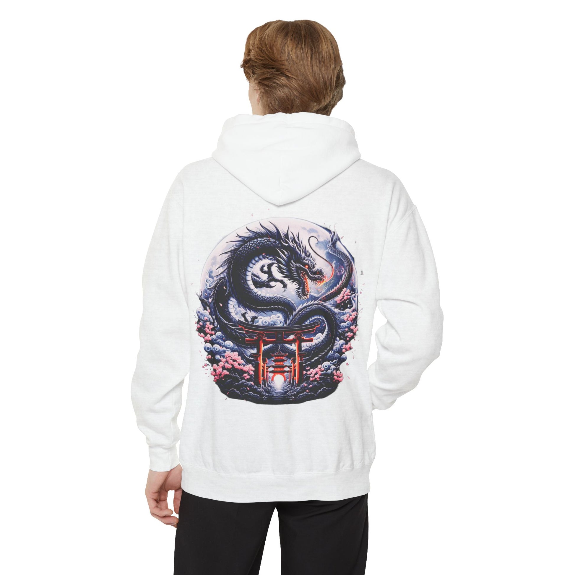 Step into a world of mystical power and serene beauty with our "Lunar Dragon Sanctuary" hoodie. This captivating design features a mighty dragon wrapped around a traditional torii gate and a pagoda, set against the backdrop of a glowing full moon. The swirling clouds and delicate cherry blossoms add an ethereal touch, creating a harmonious blend of strength and tranquility. The dragon, with its fierce yet graceful form, symbolizes protection and wisdom, making this hoodie perfect for those who embrace bold and artistic expressions. Crafted from high-quality fabric, this hoodie offers comfort, durability, and a standout design that’s perfect for any occasion. Embrace the guardian spirit of the "Lunar Dragon Sanctuary" and let it guide you with style and strength.