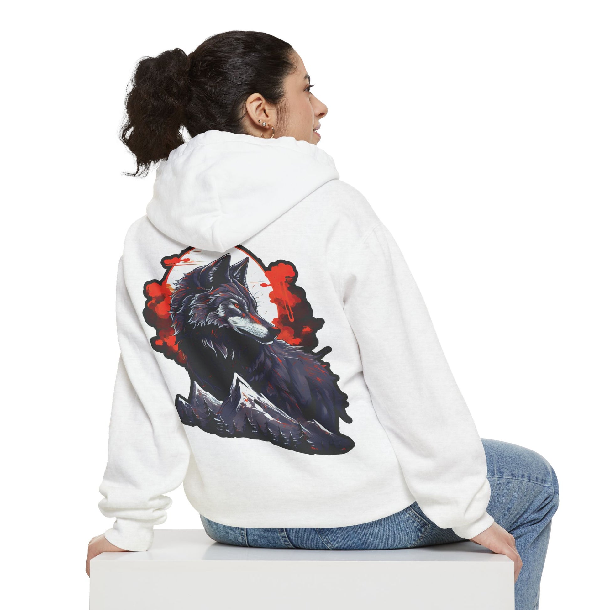 Embrace the mystique of the wild with the "Lunar Guardian Wolf" hoodie! This striking design features a majestic wolf standing vigilant against a backdrop of a glowing full moon and dramatic red-orange clouds. The wolf, with its fierce and focused gaze, exudes strength and wisdom, capturing the essence of the untamed wilderness.