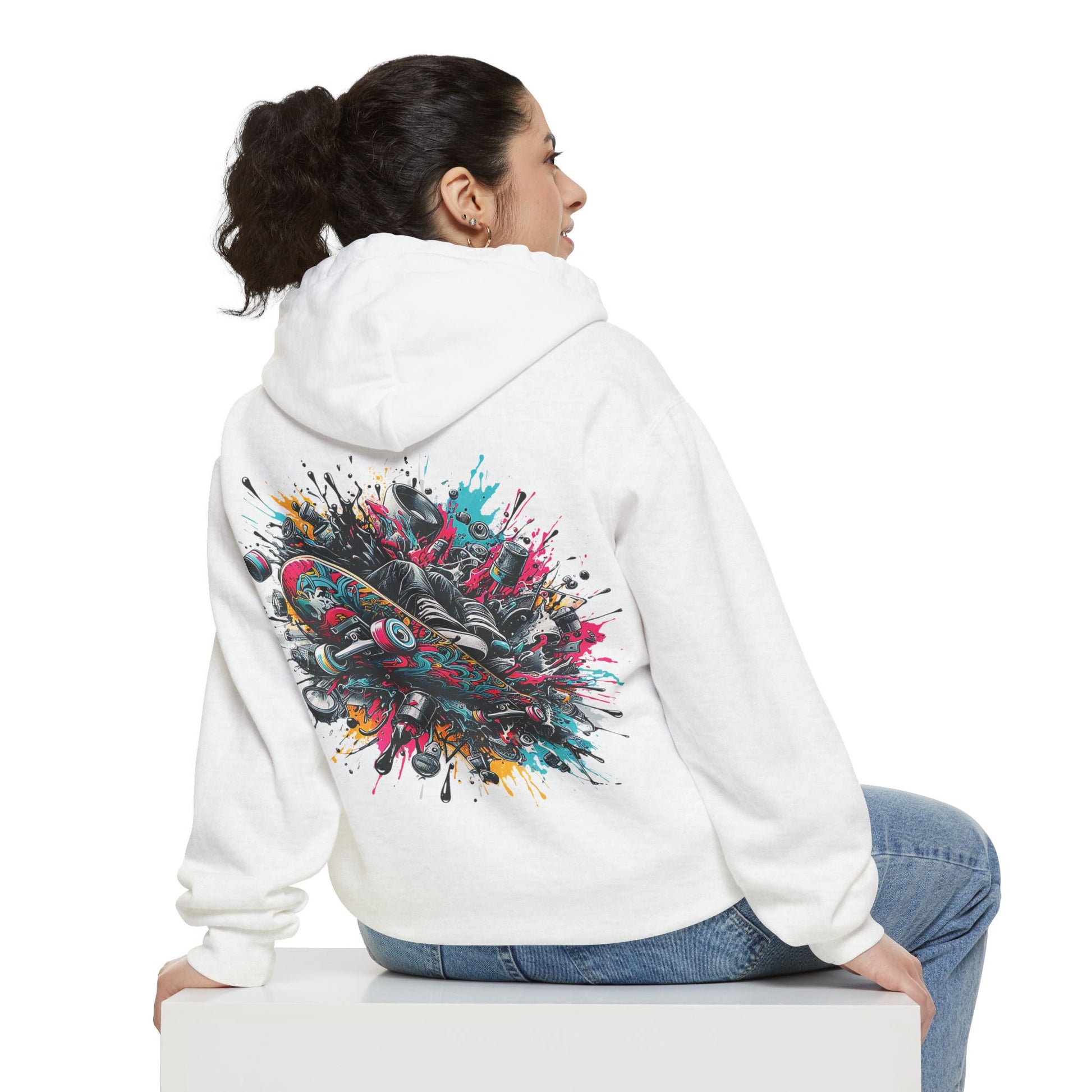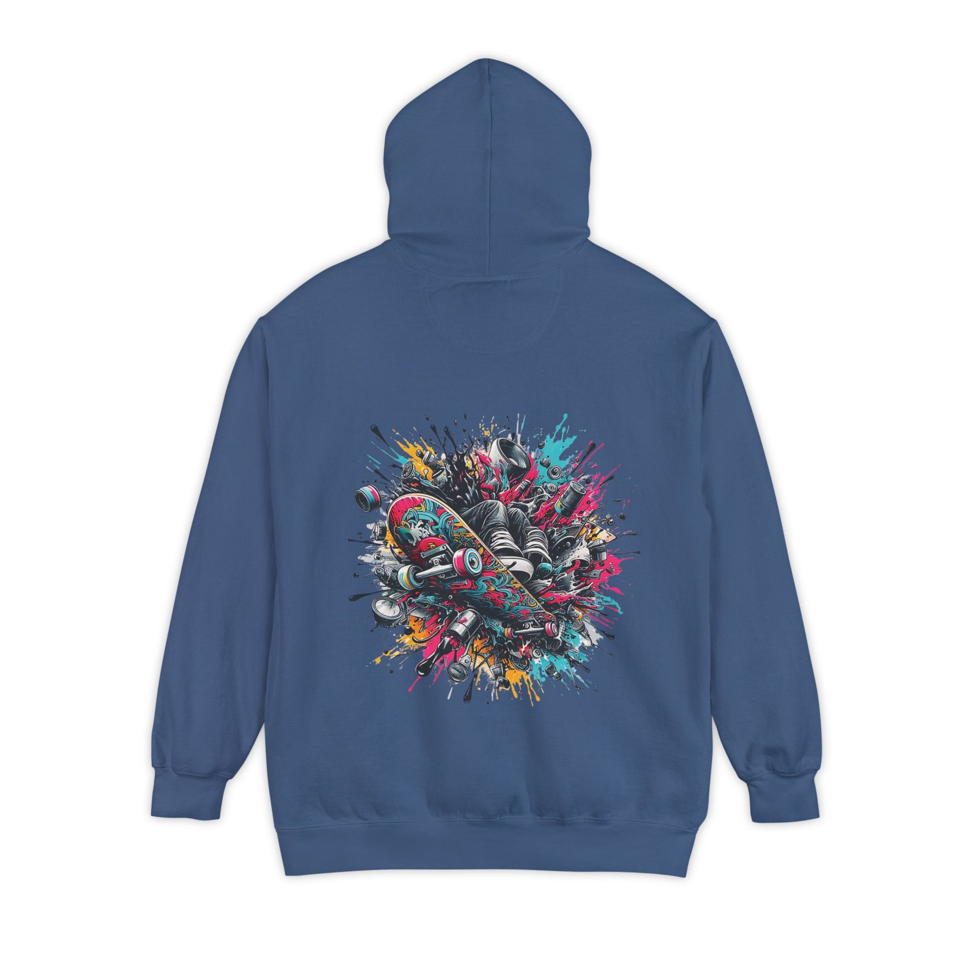 Unleash the vibrant energy of the skate park with the "Skate Splash" hoodie. This dynamic design captures the thrill and chaos of skateboarding with an explosion of colors, spray paint cans, and a skateboard in mid-air. The intricate details and bold splashes of color convey a sense of motion and adrenaline, making it perfect for skaters and street art enthusiasts. Made from premium, soft cotton, this hoodie offers both comfort and style, ideal for casual wear or a day at the skate park.