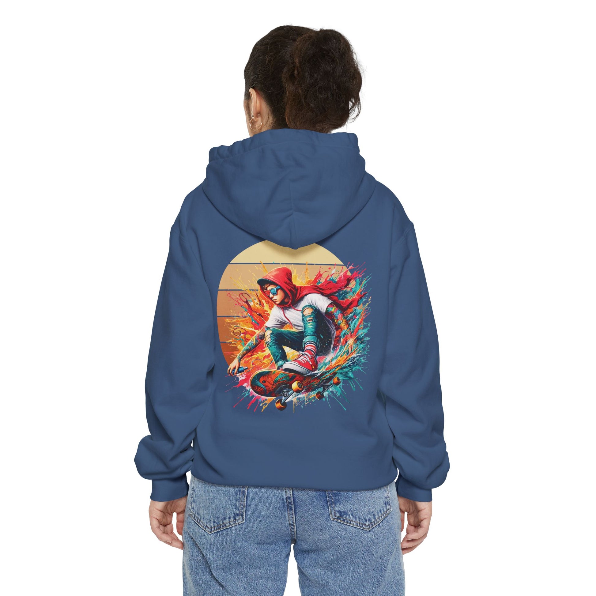 Get ready to ride in style with the "Skater 4 Life" hoodie. This vibrant and dynamic design captures the essence of street culture with a bold depiction of a skater in mid-action, surrounded by a splash of colorful graffiti elements. The skater, donning a red hoodie and cool sunglasses, exudes an edgy and carefree attitude that is synonymous with the skateboarding lifestyle. The sunset-inspired background adds a touch of warmth and nostalgia, making this hoodie a perfect blend of art and urban culture. Crafted from high-quality fabric, this hoodie ensures maximum comfort and durability for all your skateboarding adventures.