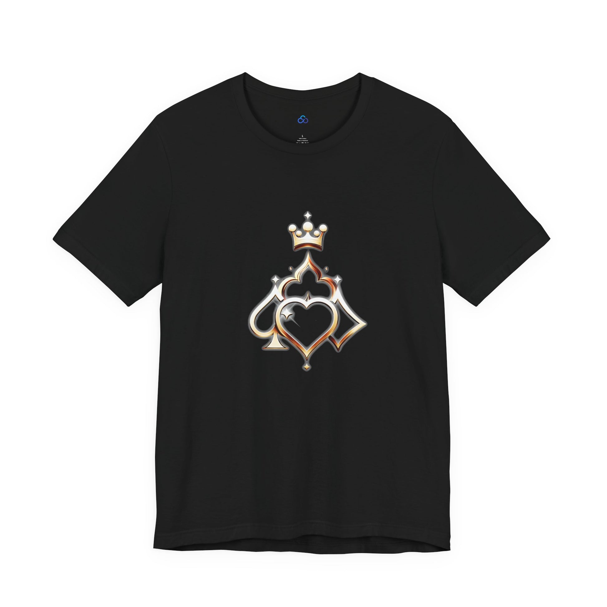Elevate your wardrobe with our "Throne of Hearts" t-shirt. This elegant and striking design features a unique combination of card suits—spade, heart, club, and diamond—interwoven to create a majestic emblem crowned with a golden crown. The sophisticated use of white and gold hues adds a touch of luxury and regality to the design, making it perfect for those who appreciate a blend of classic and contemporary styles. Printed on high-quality, comfortable fabric, this t-shirt is ideal for casual wear or special occasions where you want to stand out with a touch of class and elegance.
