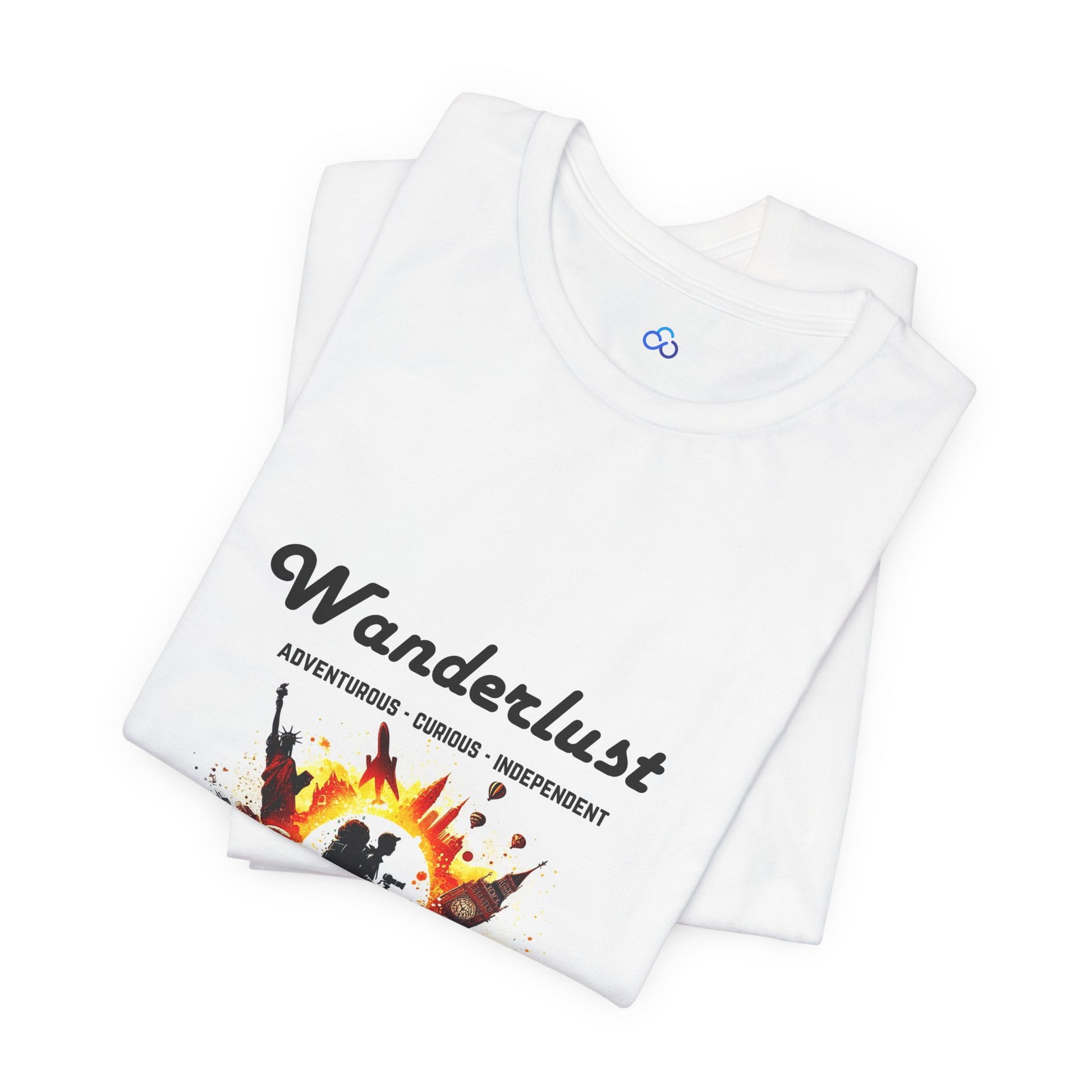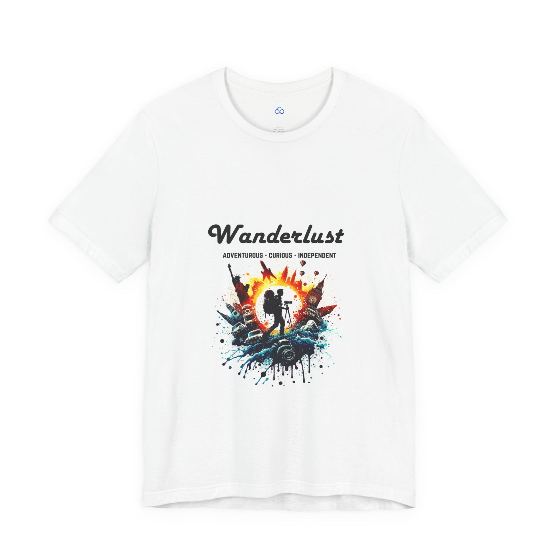 Fuel your adventurous spirit with our "Wanderlust Chronicles" t-shirt. This dynamic design features a silhouette of a traveler capturing the world through a camera, surrounded by iconic landmarks and symbols of exploration, including the Statue of Liberty, Big Ben, and hot air balloons. The vibrant colors and splash effects bring the scene to life, highlighting the essence of being "Adventurous, Curious, Independent." Printed on high-quality, comfortable fabric, this t-shirt is perfect for those who live for travel and discovery. Ideal for casual wear, it serves as a reminder of the endless adventures waiting to be explored.